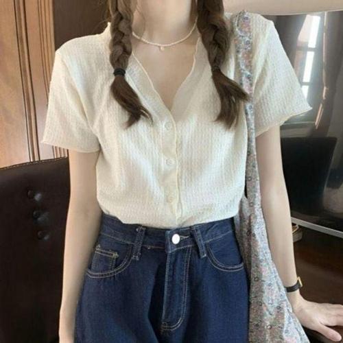 [에이치플러스몰]브이넥 인기 크롭기장 반팔 주름패턴 감성 여름 가디