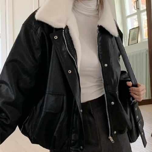 [신상오픈런]여성용 겨울 하이넥 프릴 가죽 자켓 더블버튼 금장 벨트 스타일