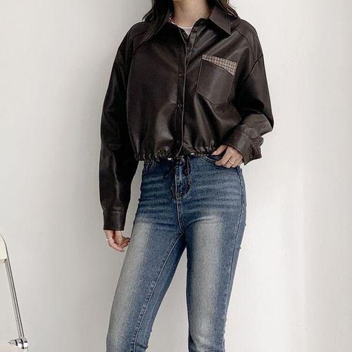 [신상오픈런]여자 레이어드 체크셔츠 포켓 카라넥 스트링 가죽 점퍼