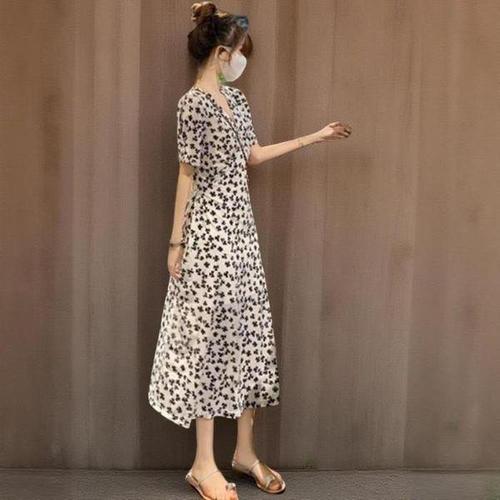 [다잇템][다잇템] 여성 반소매 롱 리본 허리띠 사랑스러운 문양 V넥 드레스_22147547_588872