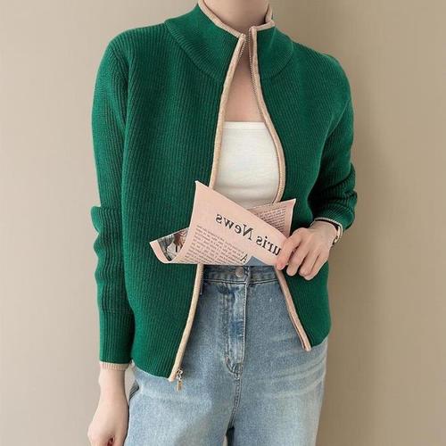 [신상오픈런]여성 배색 롱슬리브 니트 집업 목폴라 가을 가디건 (40724102)