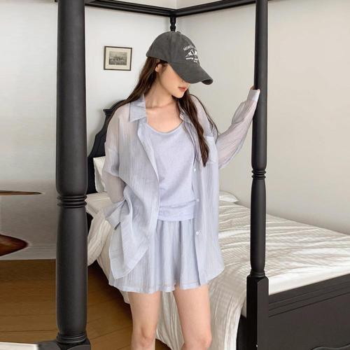 [신상오픈런]여성 여름 시스루 루즈핏 셔츠 나시와 반바지 3종 세트