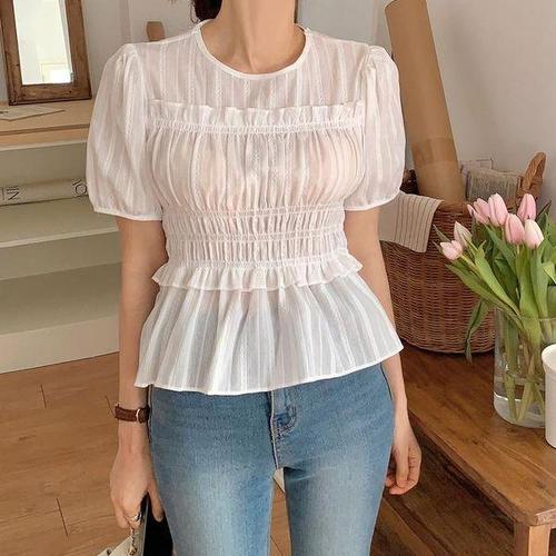 [다잇템_패션]여자 잔주름 프릴 벌룬 비침 스모킹 블라우스
