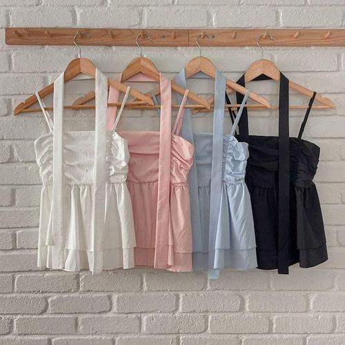 [다잇템]여성 리본 격자 스모킹 볼드숄더 탱크 셔츠