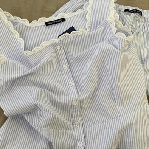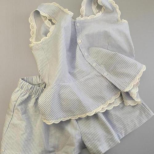 [신상오픈런]여자 캐주얼 줄지 어깨끈 레이스 반바지 홈웨어 세트 (39079810)