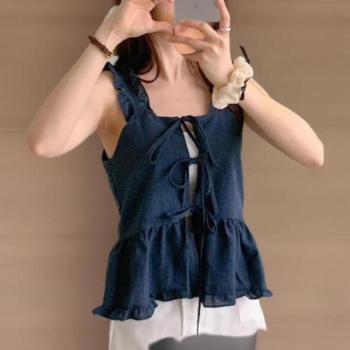 [신상오픈런]여성 여름 해변 핫팬츠 프릴 리본 오픈 잔체크 나시 (33435134)