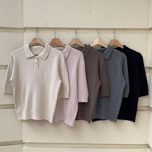 [다잇템]여자 반소매 단추 패턴 스카시 카라티 니트