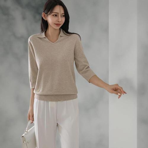 [다잇템][다잇템] 여자 스카시 반소매 가을출근룩 단추 패턴 카라티 니트_23226431_588872