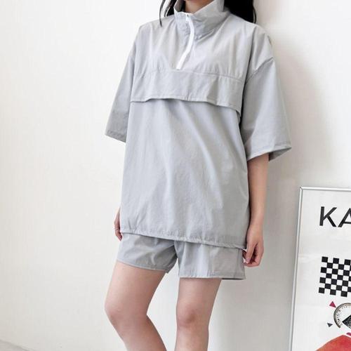 여성 하프집업 트레이닝세트 반팔티 반바지 루즈핏 카라넥 크링클 여름 티셔츠 밴딩 팬츠 운동복