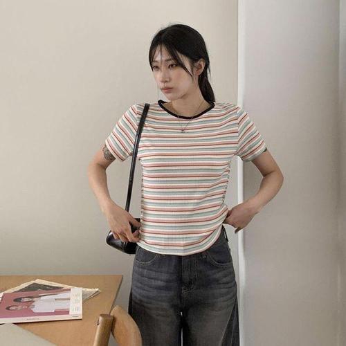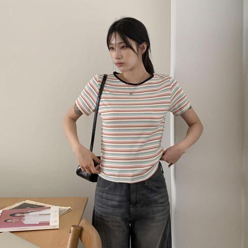 [다잇템]여자 콘트라스트 편한 줄무늬 U넥 폴리 반팔티