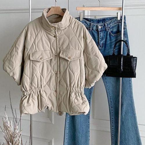 [옷자락] 여성 캐주얼 퀄팅 반팔 점퍼 금장 버튼 스트링 패딩