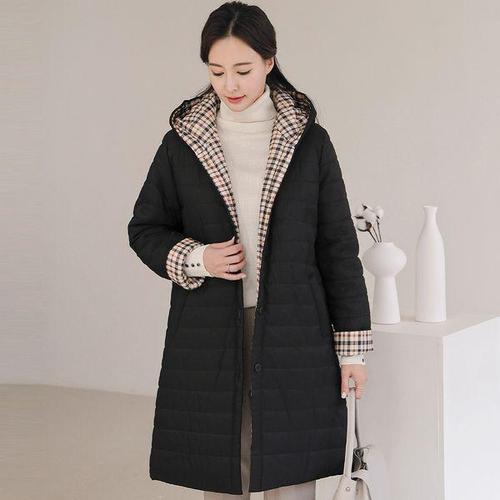 [드리다]중년여성옷 엄마옷 겨울 체크 후드 빅사이즈 롱 패딩 점퍼 50-60대 마담옷 하객 상견례 모임 선..