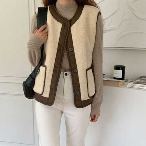 [신상오픈런]여자 뽀글이 배색 스웨이드포켓 단추 겨울 양털 조끼 (42357286)