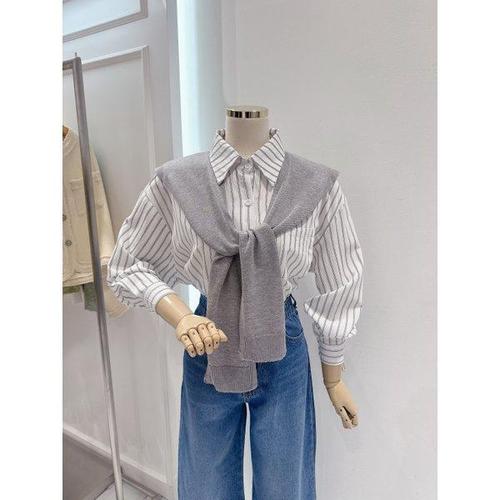 옷자락 / 여자 크롭남방 스트라이프 카라넥 데일리룩 봄 셔츠