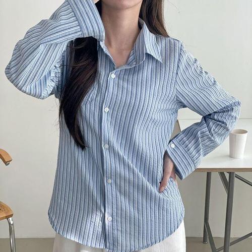 [옷자락]여자 오피스룩 줄지 스트라이프 포켓 카라넥 봄 셔츠