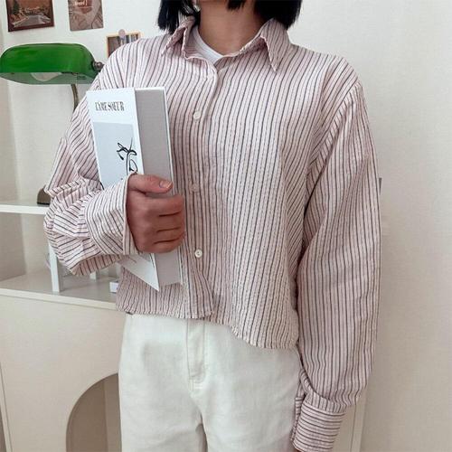 [옷자락]여자 크롭남방 스트라이프 카라넥 데일리룩 봄 셔츠