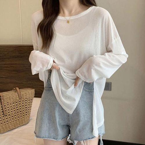 샵앤) 국산 여성 여름 시스루 라운드 긴팔 니트 티셔츠 WDM-WKN-2LCBB1023
