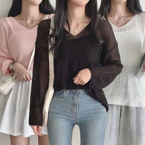 [에이치플러스몰]브이넥 티 긴팔 망사 여름니트티 니트티 여성봄