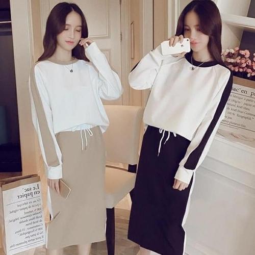 [옷자락]여성 운동 배색 라운드넥 티셔츠 롱 스커트 세트