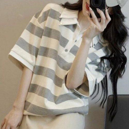 [옷자락]여성 스트라이프 자수 프린트 카라넥 반팔 셔츠