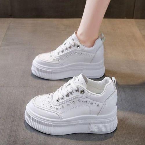 [올팜슈즈] 가죽 여성 보석 포인트 발편한 쿠션 통굽 스니커즈 키높이운동화