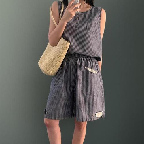 [신상오픈런]여자 스트라이프 4부 버튼 와이드핏 린넨 청반바지 (39079772)