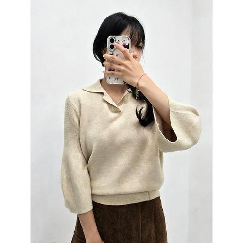 [샵앤]여성 오픈 카라넥 퍼프 7부소매 니트 티셔츠 SIU-WKN-4939-베이지