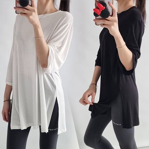 나야홍 / 여성 오버핏 찰랑 트임 무지 레이온 스판 롱 7부 티셔