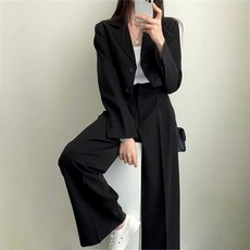 여성 정장 투피스 긴팔 크롭 숏 자켓 + 밴딩 하이웨스트 와이드 슬랙스 팬츠 세트 하객룩 오피스룩 출근룩