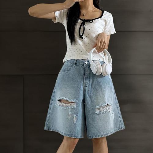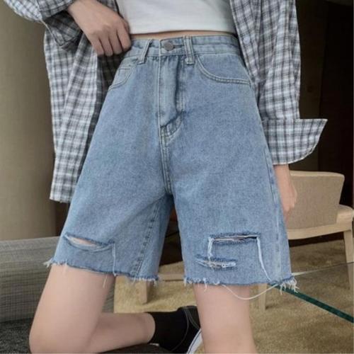 [신상오픈런]여성용 찢어진 데미지 연청 버뮤다 청반바지 (34574802)