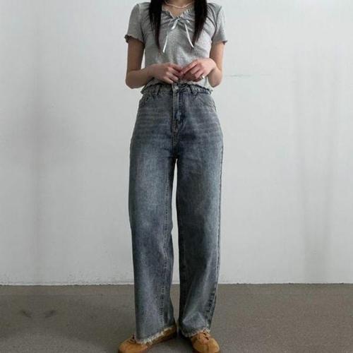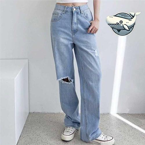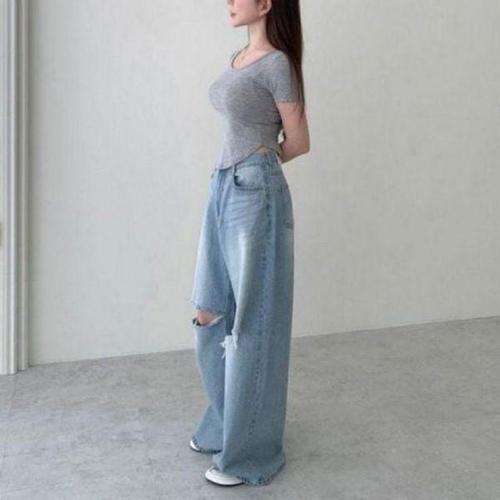 [신상오픈런]여성 연청색 와이드핏 워싱 찢청 구제 진