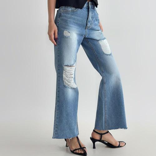 [미라클세븐]여성 연청색 와이드핏 워싱 찢청 구제 진