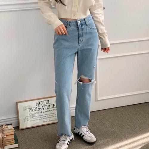 [신상오픈런]여성 연청색 와이드핏 워싱 찢청 구제 진 (39101774)