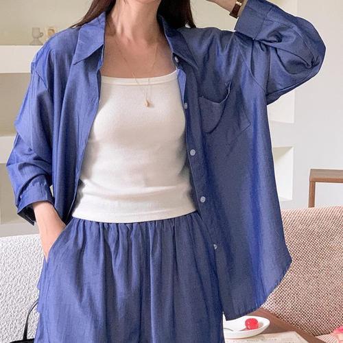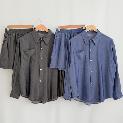 [신상오픈런]여성 루즈핏 포켓 언발란스 긴팔 청셔츠 밴딩 숏팬츠 세트 (39101600)