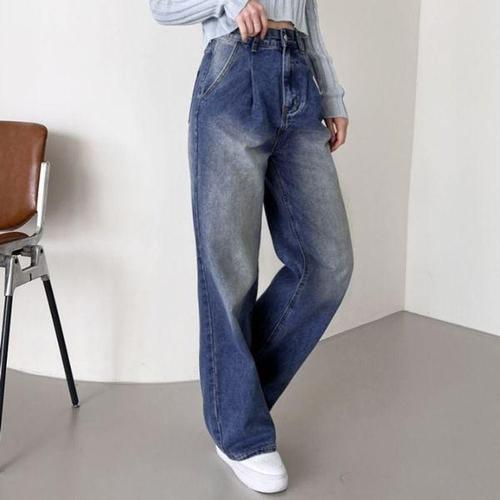 (다리 길어보이는) 빅사이즈 여성 하이웨이스트 통바지 통 데님팬츠 바지 여름 신상 편한 롱 워싱 포켓 빈티지 오버핏 예쁜 데일리 하의 패션 얇은 와이드 블루 일자 연청바지 청바지