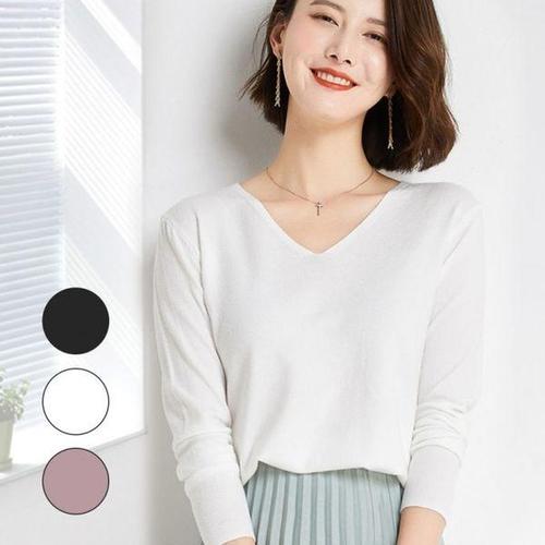 [에이치플러스몰]상의 화이트 니트 무지티 긴팔 여성 이너 가을 브이넥