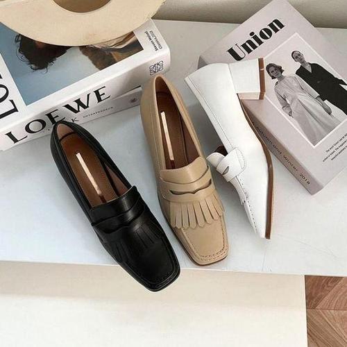 [셀러허브_여성트랜드패션]통굽 소가죽 미들굽 키높이 페니 로퍼힐 프린지