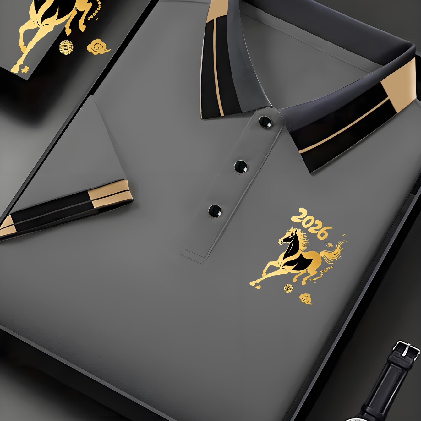 TEMU 갑자년; 사방에서 부를 상징하는 황금 말; 프린팅 남성용 속건성 반팔 셔츠, 가벼운 셔츠, 기계 세탁 가능, 사계절용, 비즈니스/캐주얼/골프웨어 (크리스마스/새해/선물), Ide
