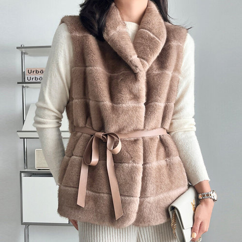 [옷자락] 여자 연말룩 파티룩 리본 허리끈 줄무늬 인조밍크 조끼