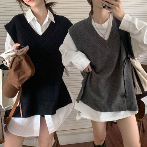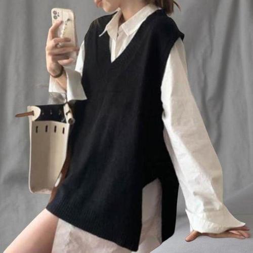 [당일발송] 오버핏 V넥 레이어드 언발 옆트임 슬릿 니트 조끼 베스트