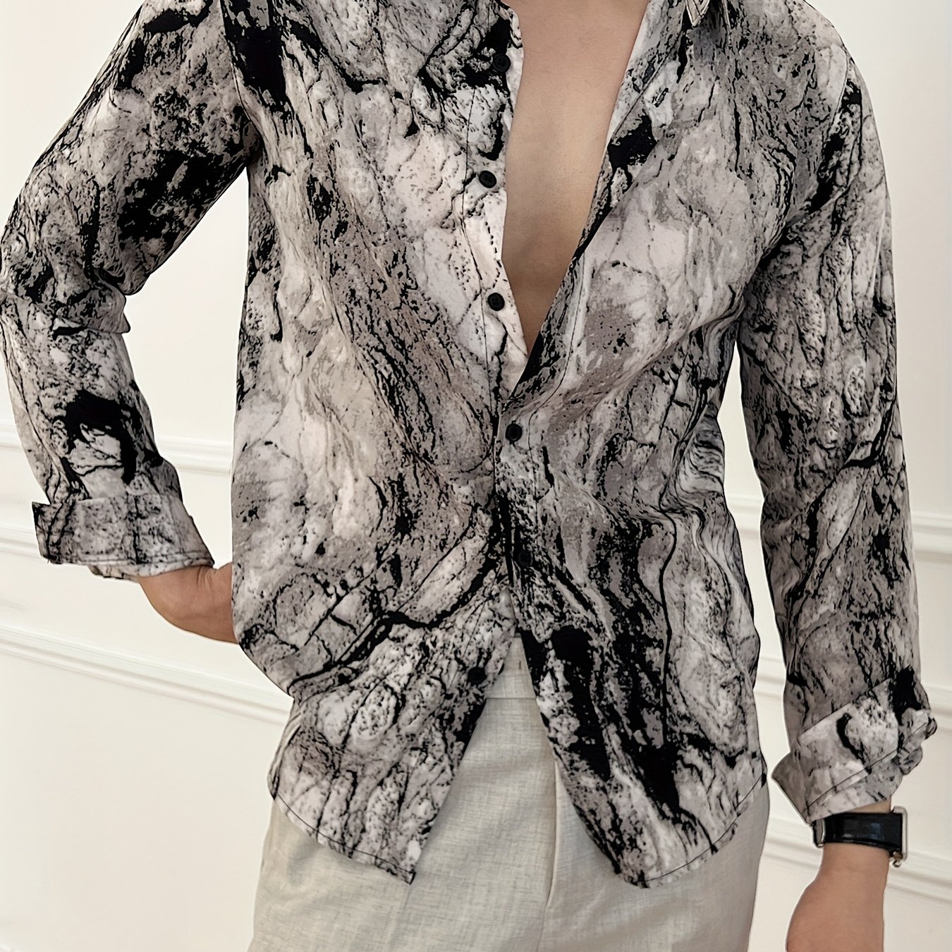 TEMU 남성용 빈티지 마블 프린트 긴팔 셔츠, 봄 가을 캐주얼, 통기성, 주름 방지