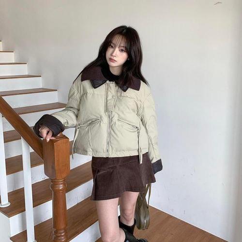 [에이치플러스몰]하이퀄 오리털 자켓 간절기 여성경량패딩 여성보온 배색 카라 코트 패딩점퍼