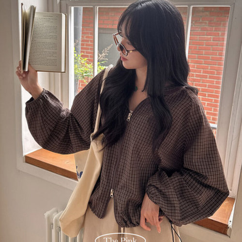 [옷자락]여성 캐주얼 체크 오버핏 스트링 후드 바람막이 점퍼