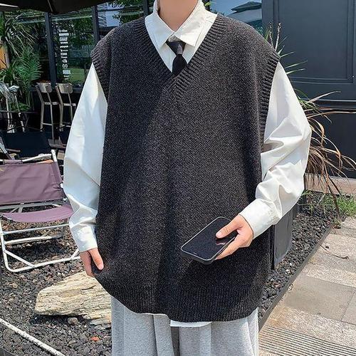 Vezri 남성 V넥 니트 베스트 봄가을용 오버핏 무소매 캐주얼 스타일 데일리 조끼 F88