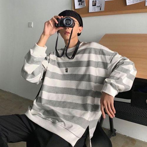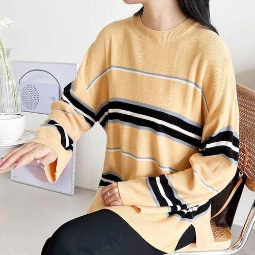 [에이치플러스몰]심플 스트라이프 니트 루즈핏 옆트임 라운드넥 트랜디