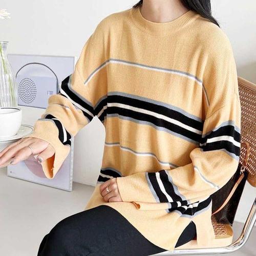 [에이치플러스몰]여성오버핏 스트라이프 니트 절개 루즈핏 옆트임 긴팔