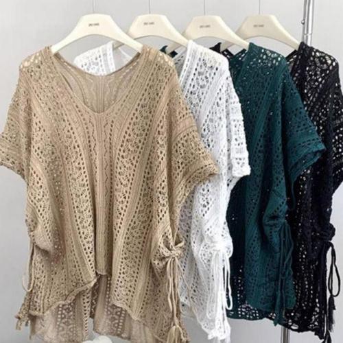 [에이치플러스몰]여름 오버핏 반팔 그물 니트 시스루 브이넥 루즈핏 펀칭