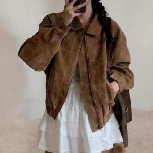 여성 캐주얼 깔끔핏 데일리룩 데이트룩 스웨이드 루즈핏 밑단밴딩 패션 숏자켓