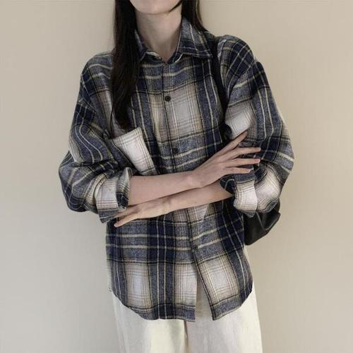 [신상오픈런]여성 체크 패턴 오버사이즈 기모 긴팔 셔츠 (44092089)