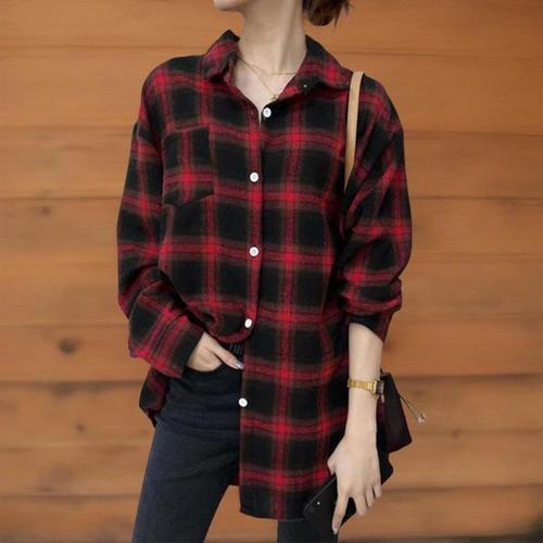 여성용 데일리 루즈핏 체크 남방 빅사이즈 미디 일반 칼라 긴팔 셔츠
